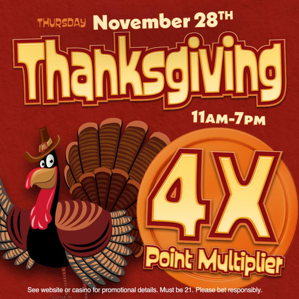 Happy Thanksgiving, we are thankful for YOU! Earn 4x the points on your Players Card this Thanksgiving from 11am – 7pm!