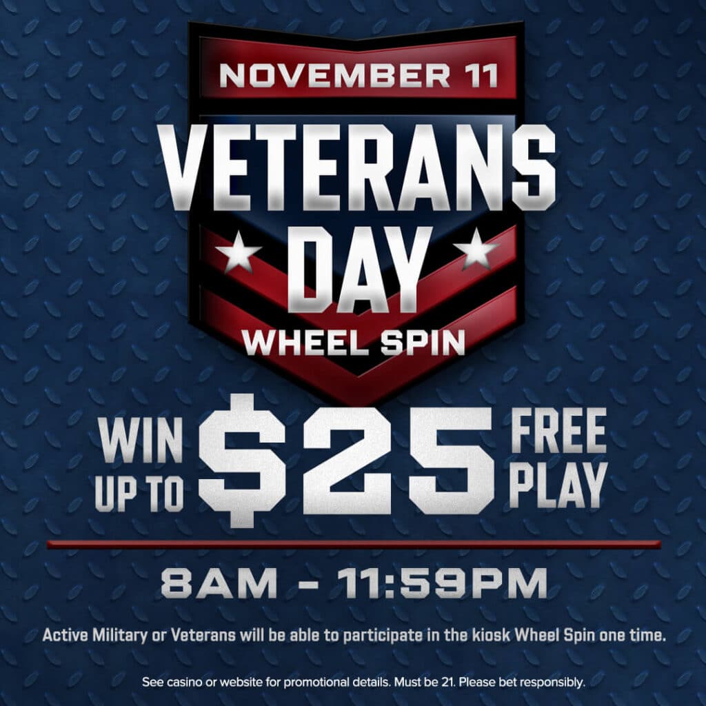 Thank you Veterans, we appreciate all that you do! In honor of Veterans Day. Active Military and Veterans will be able to participate in the kiosk wheel spin from 8am – 11:59pm on November 11th and win up to $25 in free play!